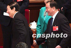 十屆全國人大一次會議三月十八日閉幕后,王樂泉代表握住朱镕基的手久久不愿放開。作者:張煒
