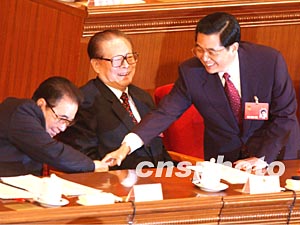 新當(dāng)選的中國國家主席胡錦濤,三月十八日在十屆人大一次會議的閉幕式上,向九屆全國人大委員長李鵬握手致謝。作者:賈國榮