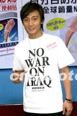歌星方力申3月18日在香港出席一宣傳活動(dòng),身穿印有NO WAR ON IRAQ字樣的T恤,希望戰(zhàn)事不會(huì)爆發(fā)。中新社傳真 鄧慶樂 攝