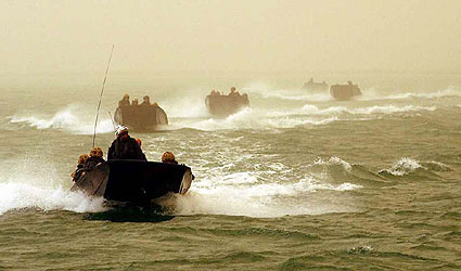 驚天動地的大爆炸之后,英國皇家海軍陸戰(zhàn)隊第3突擊旅和美海軍陸戰(zhàn)隊遠征小隊的官兵們分乘武裝直升機和汽墊船直向法奧半島的“紅灘”撲去。由于“紅灘”是“肖特-阿拉伯水道”與海灣的戰(zhàn)略接點,所以美英陸戰(zhàn)隊都覺得惡戰(zhàn)難免。然而,讓他們大感意外的是,當全幅武裝的美英軍人如狼似虎地撲向灘頭陣地時,發(fā)現(xiàn)那里根本沒有伊拉克軍人,整個灘頭安靜得讓人不可思議,唯一的活動的目標是兩條沖著他們汪汪亂叫的狗,似乎就它們對不速之客的入侵有意見!美國的海豹特種戰(zhàn)部隊為謹慎起見,還是清除了灘頭,把兩只汪汪亂叫的狗趕跑,然后迎接乘坐“支努干”重型運輸直升機和“海王”直升機降落的英軍大部隊。