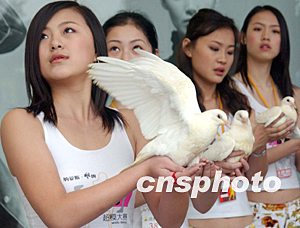 正值伊拉克戰(zhàn)爭之際,在廣州參加“納愛斯雕牌2003超級模特選拔賽”的佳麗,手捧和平鴿祈盼世界和平、反對戰(zhàn)爭。作者:錢興強