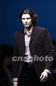 三月二十六日,“杉杉”秋冬男裝發(fā)布會在北京舉行,整體的服裝風(fēng)格以簡約、舒適為主流。圖為模特展示一款時尚男裝。作者:盛佳鵬