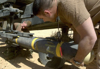 美101空降旅士兵為AH-64阿帕奇直升機(jī)安裝“地獄火”反坦克導(dǎo)彈