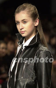 在二00三年東京秋冬時(shí)裝展上,日本各路時(shí)裝設(shè)計(jì)師順次登場(chǎng)發(fā)表新作。圖為模特28日晚演示著名時(shí)裝設(shè)計(jì)師鳥居由紀(jì)的皮革新作。作者:陶光雄