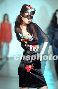 三月二十八日晚,“愛美”時(shí)裝在北京昆侖飯店舉行春夏時(shí)裝流行趨勢發(fā)布會(huì),一名戴面具的模特展示一款性感時(shí)裝。作者:盛佳鵬