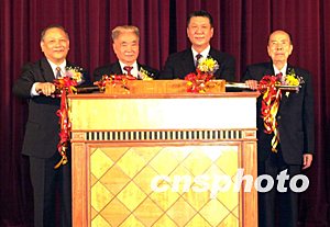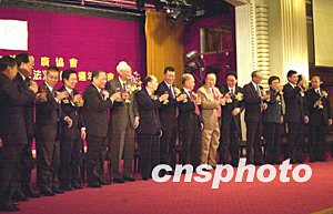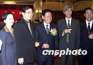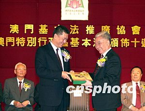 何厚鏵、原全國人大常委會副委員長王漢斌、全國政協(xié)副主席馬萬祺及中央駐澳聯(lián)絡(luò)辦主任白志健在酒會為紀念《澳門基本法》頒布十周年電視特輯首播儀式揭幕。作者:李剛