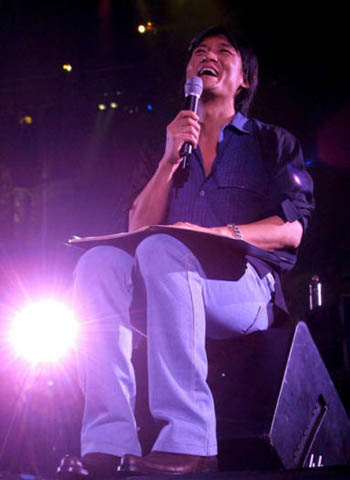 之后出場的表演嘉賓黃品源也不忘借機(jī)幽了周華健一默說∶“還痛不痛?我剛才很擔(dān)心。”(周∶我沒事!)我是擔(dān)心接下來的演出會(huì)要我?guī)兔ν瓿!”氣得周華健險(xiǎn)些就要“拳腳相向”向他揮過去!接下來兩人你一言我一語的“留”字接口令,更是將整個(gè)氣氛搞輕松,尤其是黃品源一句“留長發(fā)是為了遮住一邊的眼睛,好讓自己看得更清楚,‘一目了然’!”能言善道的周華健也被黃品源的“急智”給搞到語塞,笑得接不下去。