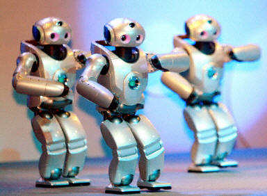 圖為日本索尼公司人形機器人SDR-4X II在“2003機器人展覽會”上展示跳集體舞技能。