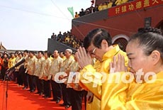 4月4日,河南新鄭市始祖山軒轅廟前,“黃帝故里拜祖”大典隆重舉行,圖為世界華人華僑社團(tuán)聯(lián)合總會(huì)會(huì)長(zhǎng)宣讀拜祖文。河南新鄭是黃帝故里,1992年以來(lái),每年都有來(lái)自海外的炎黃子孫前來(lái)登山朝圣。作者:慎重