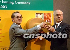 香港郵政4月4日發(fā)行紀念封,紀念香港郵政參與由香港郵學會主辦的香港郵展2003。圖為香港郵政副署長曾國林及香港郵學會張文德醫(yī)生在紀念封上蓋印。作者:洪少葵