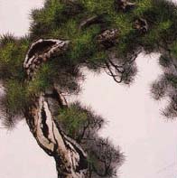 沈銀河的兩幅參展作品是以尖細(xì)的樹葉和濃烈的綠色表現(xiàn)出旺盛生命力的松樹水墨彩畫。閔庚燦表示,“沈銀河的畫力度感強(qiáng),而且線條柔和。筆法非常出眾!