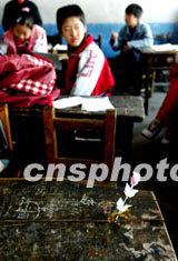 遼寧海城市鐵西小學(xué)六年級(jí)三班學(xué)生在李洋生前的課桌上擺上塑料花,表示哀悼。這是“三·一九”豆奶事件中惟一一例死亡事件,但官方稱,尚不能確定死亡原因是否和豆奶中毒有關(guān)。作者:鄭萍萍