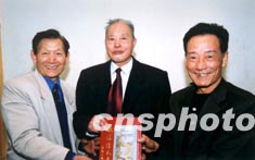 金門(mén)陳氏宗親會(huì)理事長(zhǎng)陳添丁(左一)四月十四日在廈門(mén)接受廣東汕尾市陳氏的族譜,該族譜對(duì)臺(tái)灣陳氏幾百年的歷史有詳細(xì)描述。作者:陳勇