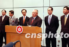 香港特首董建華連同政府高官,4月23日在政府總部宣布將推出118億港元的八項救市措施,紓緩SARS疫情對本港經(jīng)濟的影響。中新社傳真 洪少葵 攝