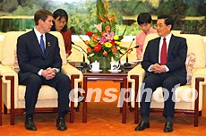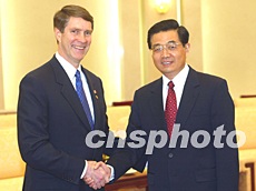 四月二十一日,中國國家主席胡錦濤在人民大會堂會見由參議院多數(shù)黨領(lǐng)袖比爾·弗里斯特率領(lǐng)的美國參議院訪華代表團。