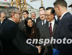 國務(wù)院總理溫家寶,二十五日在北京陪同法國總理拉法蘭(左二)參觀國家大劇院工地。作者:滿會喬