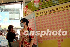 香港一購物商場特設顧客心意咭,感謝為對抗非典型肺炎的醫(yī)護人員。據醫(yī)管局26日公布,首次有醫(yī)護人員在照顧SARS病人時受到感染而殉職。洪少葵 攝