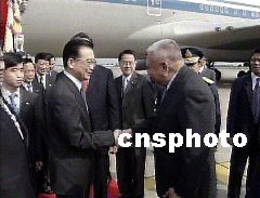 中國總理溫家寶二十九日上午飛抵泰國首都曼谷,準(zhǔn)備出席關(guān)于非典型肺炎問題的中國——東盟領(lǐng)導(dǎo)人特別會(huì)議。圖為香港特首董建華在機(jī)場迎接溫家寶總理。中新社圖
