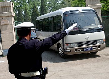 交通警察指揮北京市委書記一行的考察車進入醫(yī)院。