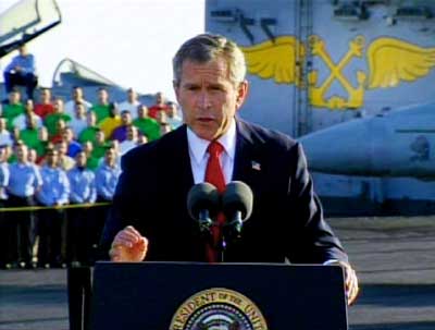 在充滿感情的言辭中,布什不僅僅稱贊推翻薩達姆政權(quán)的美軍官兵,更是大講特講“9-11”恐怖襲擊,從而將伊拉克戰(zhàn)爭與反恐戰(zhàn)爭融為一體,布什用充滿感情的言辭說:“我們不應(yīng)該忘記9-11遇難的人們,不應(yīng)該忘記遇難者們打的最后一個電話,不應(yīng)該忘記孩子們慘遭冷酷的謀殺,不應(yīng)該忘記在廢墟中搜尋的日子。因為這些恐怖襲擊,因為恐怖分子和支持者們向美國宣戰(zhàn),所以他們也得到了戰(zhàn)爭的報應(yīng)。”布什還用強硬的措辭警告任何“與恐怖組織有關(guān),試圖擁有大規(guī)模殺傷性武器的無法無天的國家”,它們對“文明世界形成了嚴(yán)重的威脅,一定會遭到抵抗的!辈际策@番話顯然是在直接警告伊朗等國家,并且暗示美國同樣敢對它們采取行動。