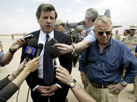 新任美國(guó)駐伊拉克行政長(zhǎng)官布雷默(左)12日飛抵伊拉克巴格達(dá)機(jī)場(chǎng),正式到職就任。布雷默將接替前美國(guó)將軍加納,負(fù)責(zé)監(jiān)督伊重建工作與政治重組。圖為布雷默當(dāng)天在巴格達(dá)機(jī)場(chǎng)接受媒體訪問(wèn)。