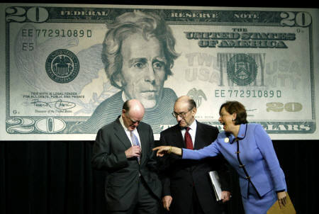 美國(guó)財(cái)長(zhǎng)斯諾(左)與聯(lián)邦儲(chǔ)備理事會(huì)主席格林斯潘13日一同出席新版20美元鈔票發(fā)行儀式。