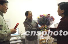 中國(guó)新聞社北京總社百名新聞工作者代表李艷良(右),十二日到北京人民醫(yī)院向奮戰(zhàn)在抗“非典”一線的醫(yī)護(hù)工作者送去13,955元人民幣慰問(wèn)款和慰問(wèn)信。中新社記者:鄒憲