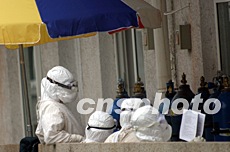 收治“非典”病人的定點(diǎn)醫(yī)院北京地壇醫(yī)院,五月中旬派出流動(dòng)臨時(shí)出診車(chē)及出診醫(yī)生在醫(yī)院門(mén)外為在該合同醫(yī)院就診的市民抽血檢測(cè)、發(fā)放藥品及診治常規(guī)疾病。中新社記者:鄒憲