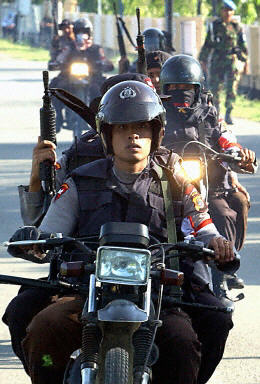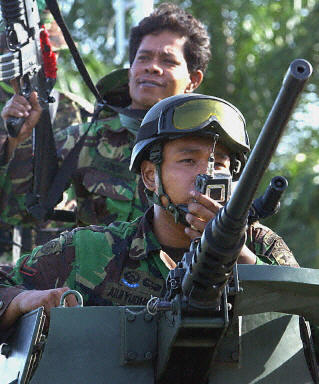 印度尼西亞政府18日宣布將對(duì)亞齊叛軍實(shí)行軍事打擊,并在該國亞齊省實(shí)施戒嚴(yán)。圖為印尼政府軍在亞齊省內(nèi)加強(qiáng)安全警戒。