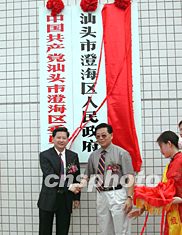 廣東汕頭澄海五月十九日舉行撤市設(shè)區(qū)揭牌儀式,汕頭市長(zhǎng)李春洪(右二)和澄海區(qū)長(zhǎng)陳棉生(左二)揭牌。作者:王惠存