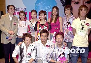 歌星黃伊汶5月21日在香港舉行新歌MV〔戒男〕首播禮,環(huán)球唱片高層陳小寶(左一)率領(lǐng)旗下眾歌星出席為黃伊汶打氣造勢。鄧慶樂 攝