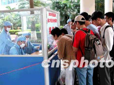 高考臨近,海南省在口岸設(shè)立接待處,對(duì)在外借讀返瓊的考生進(jìn)行嚴(yán)格檢查,以防輸入性“非典”進(jìn)入海南。作者:李建國
