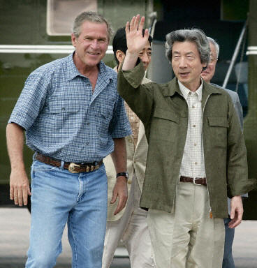 小泉與美國總統(tǒng)布什在得克薩斯州克勞福德的私人農(nóng)場(chǎng)舉行會(huì)談,兩國領(lǐng)導(dǎo)人將就伊拉克重建和朝鮮核問題等交換意見。
