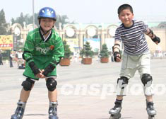兩名兒童二十四日清晨在北京展覽館廣場(chǎng)滑旱冰。隨著“非典”疫情逐漸緩解,北京的中小學(xué)生紛紛走出家門,參加各種戶外活動(dòng)。中新社記者:趙振清