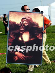 一名北京藝術(shù)家捧出戴防毒面具的《蒙娜麗莎》油像新作,參加京郊五月下旬抗擊“非典”為主題的“藍(lán)天不設(shè)防”藝術(shù)行動(dòng)。中新社記者:鄒憲