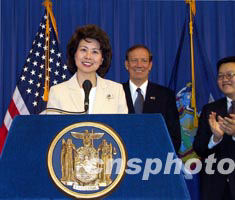 美國勞工部長趙小蘭當?shù)貢r間二十九日在紐約曼哈頓出席紐約州長柏塔基(后排右二)舉行的亞裔傳統(tǒng)月活動。作者:趙海燕