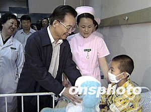 據(jù)中國中央電視臺報道,今天上午9時,溫家寶和中共中央政治局委員、國務(wù)院副總理吳儀,在中共中央政治局委員、北京市委書記劉淇,北京市代市長王岐山陪同下,來到北京兒童醫(yī)院新門診大樓。這里擁有國際一流的就診環(huán)境和診療手段,日門診量可滿足近萬名患兒就診。
