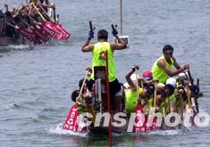 2003年澳門國際龍舟賽一日在澳門舉行,圖為澳門男子龍舟公開賽初賽中各隊(duì)奮力拚爭。 中新社記者 李剛
