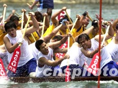 在一日舉行的2003年澳門國際龍舟賽澳門女子公開賽中,女選手巾幗不讓須眉,奮勇爭先。 中新社記者 李剛