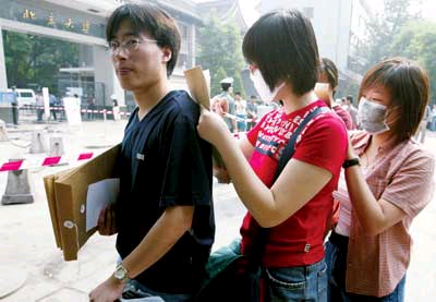 據(jù)北京娛樂信報(bào)報(bào)道,記者昨天在北大南門看到,這里戒備森嚴(yán),保衛(wèi)部負(fù)責(zé)維持南門外秩序,查驗(yàn)學(xué)生證以及《返校通知》、《返校健康登記表》等證件,學(xué)生家長親友一律被阻止在校門外。返