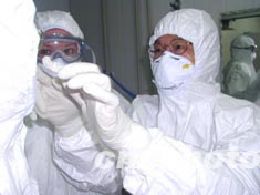 世界衛(wèi)生組織視察組人員六月三日在北京解放軍小湯山醫(yī)院視察北京防治SARS病工作時,和醫(yī)護人員進行交流。作者:安然