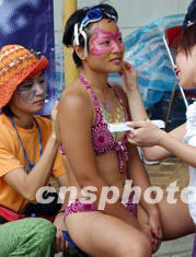 六月四日,香港赤柱舉行龍舟錦標(biāo)賽,圖為美女“運(yùn)動(dòng)員”彩繪美體,盛裝出席龍舟賽。 中新社記者 潘索菲