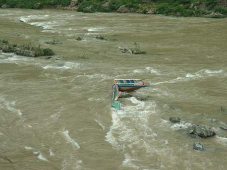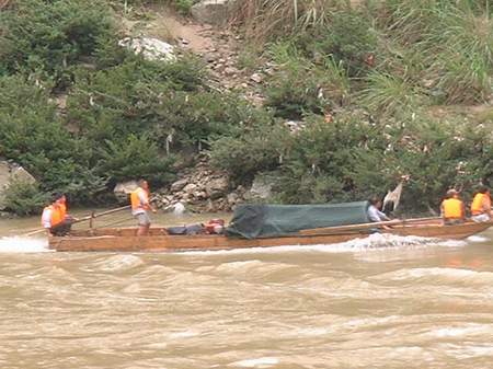 “響聲很大,很響。開始我還想這船怎么那學(xué)生來撞著玩呢!绷_安忠回憶說。船橫起來后不到兩分鐘,就折斷在礁石上了,船上的幾十名學(xué)生密密麻麻地幾乎全部掉進(jìn)水中,被湍急的河水沖洗走,只剩下一小部分人幸運(yùn)地站到河灘中間露出的礁石上面,等待施救。