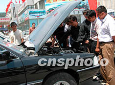 六月,北京“非典”疫情逐步得到控制,北方汽車交易市場客流量回升,十萬元左右的轎車銷路看好。圖為汽車銷售人員正在為用戶介紹國產(chǎn)轎車的性能。中新社記者 張勤 攝