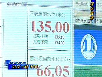 據(jù)三峽樞紐梯級調(diào)度中心肖主任介紹,因為長江上游普降中到大雨,增加了來水量,八日是上游來水量最多的一天,達到每秒一萬七千立方米,水位較前一日上升了三點五六米。但在控制范圍每天水位上升不超過五米之內(nèi),從六月一日到十日平均每天水位上升為三點零九米。