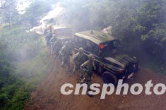 在全面防護(hù)下的中國海軍某防化部隊(duì),六月于江南某地進(jìn)行現(xiàn)代戰(zhàn)法演練,迅速通過“戰(zhàn)地”污染區(qū)。作者:楊波