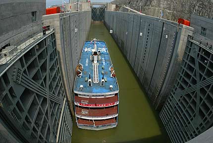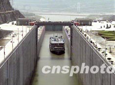 今日上午九時(shí)十分,五閘室水位已經(jīng)降到與下游水位一致,閘門(mén)已經(jīng)打開(kāi),全長(zhǎng)七十八米、寬十六點(diǎn)四米,定噸三千噸的重慶長(zhǎng)江輪船公司“江渝十五號(hào)”,在經(jīng)過(guò)周密安全檢驗(yàn)后由下游緩緩駛?cè)胛彘l室,隨后閘門(mén)緩緩關(guān)閉,輸水系統(tǒng)開(kāi)始充水抬高閘室水位,“江渝十五號(hào)”隨閘室水位上升而上升。