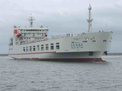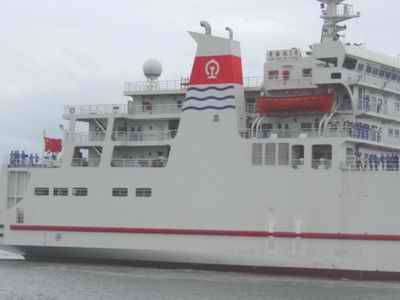 據(jù)了解,“鐵二號”從設(shè)計(jì)到造型、從長相到身材,幾乎和“鐵一號”沒有什么差異。總長度一百六十五點(diǎn)四米,寬二十二點(diǎn)六米,排水量一萬二千四百噸,載車重量四千二百噸,主甲板可以載貨運(yùn)列車車廂四十節(jié)或客運(yùn)列車十八節(jié)、旅客一千三百六十人。
