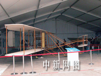 離博物館幾步路之遠(yuǎn)的一個人字型展棚里,陳列著一九零三年十二月十七日懷特兄弟駕上天的那架簡陋飛機(jī)的復(fù)制品,懷特兄弟短短五十九秒的空中飛行,揭開了人類征服地球引力的光輝篇章。