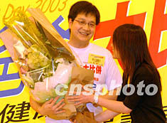為歡度一年一度的父親節(jié),香港時代廣場六月十五日舉行“做個健康爸爸努力保護頭家”活動,圖為一位患“非典”家屬向醫(yī)生獻(xiàn)上鮮花致意。錢興強 攝